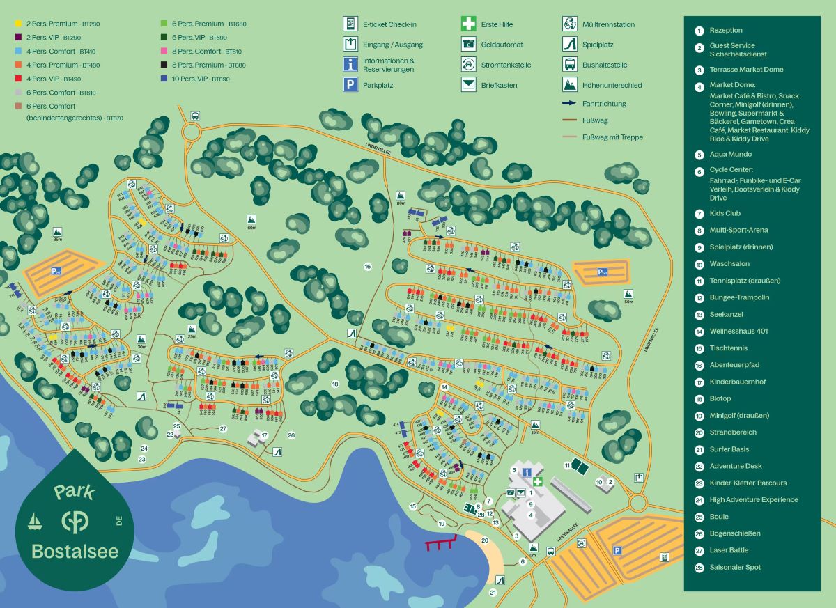 Der Center Parcs Bostalsee überzeugt durch seine zahlreichen Einrichtungen, die den Aufenthalt abwechslungsreich und komfortabel machen. Das Herzstück des Parks ist der Market Dome, ein überdachter Bereich mit Restaurants, Cafés, Einkaufsmöglichkeiten und Freizeitangeboten, in dem Gemütlichkeit und Unterhaltung im Vordergrund stehen. Für aktive Gäste bieten sich Tennisplätze, Minigolf und diverse Wander- und Radwege an, die direkt vom Park aus starten. Der angrenzende Bostalsee ist ein wahres Wassersportparadies mit Segeln, Windsurfen, Stand-up-Paddling und Kajakfahren. Wer es lieber ruhig mag, entspannt am Sandstrand oder spielt eine Partie Beachvolleyball.
