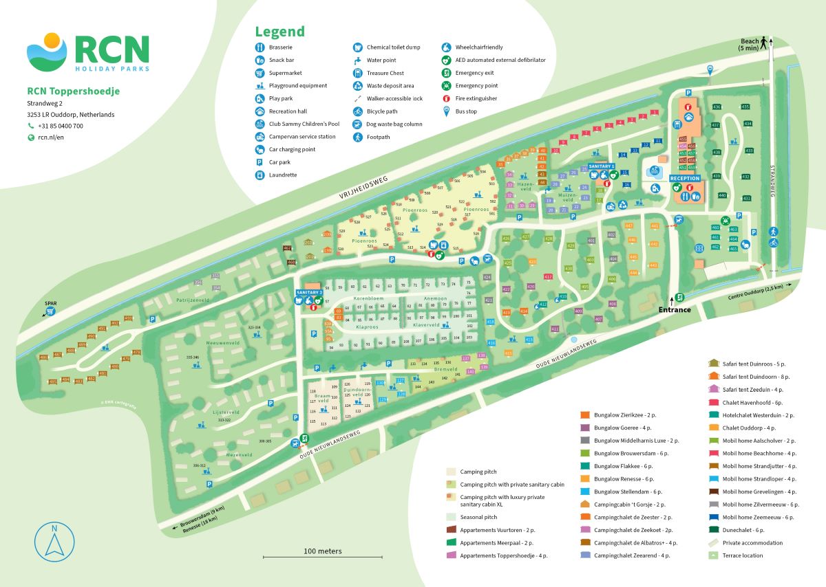 Der Ferienpark RCN Toppershoedje liegt direkt an einem wunderschönen breiten Sandstrand, also ideal für einen herrlichen Strandurlaub. Auf dem Ferienpark können Sie campen oder in einer der Mietunterkünfte übernachten. Der Tag beginnt natürlich mit frischen Brötchen, die Sie in der Croissanterie abholen können. Zudem können Sie im Restaurant herrlich essen gehen, aber auch das Abholen eines Snacks ist möglich. Der gemütliche Badeort Ouddorp ist etwa 1 Kilometer entfernt, hier können Sie unter anderem shoppen oder gemütlich ein Getränk auf der Terrasse genießen. Für die sportlicheren Urlaubsgäste gibt es wunderschöne Wanderwege und Fahrradrouten in der Umgebung des Parks.