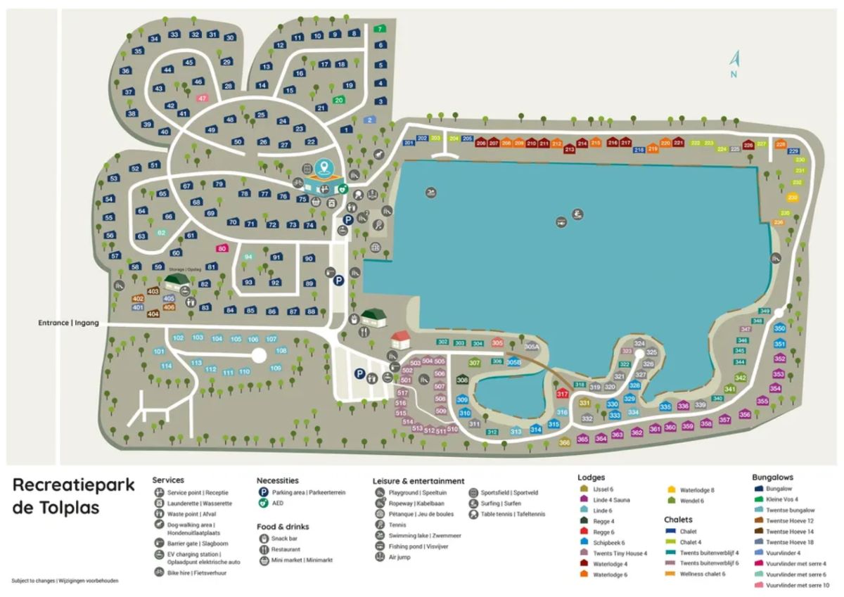 Die Unterkünfte im Recreatiepark De Tolplas sind so vielfältig wie die Bedürfnisse der Gäste. Von gemütlichen Chalets bis hin zu luxuriösen Bungalows – hier findet jeder die passende Unterkunft. Alle Ferienhäuser sind komfortabel eingerichtet und bieten moderne Annehmlichkeiten, um Ihren Aufenthalt so angenehm wie möglich zu gestalten. Viele der Chalets und Bungalows bieten zudem einen atemberaubenden Blick auf den See, der das Zentrum des Parks bildet.
